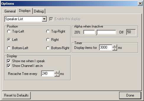 POsostałe opcje to wświetlanie swojego nicka jak mówimy oraz nazwy kanału. Dodatkowo czas odśiwerzanai listy z danymi o TS (240ms).