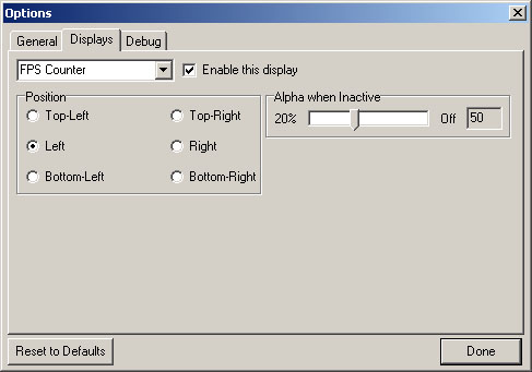 FPS Counter – podaje ilośc klatek na sekundę jaka jest generowane w grze, średnia z ostatniej sekundy, może nie byc dokładna.