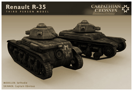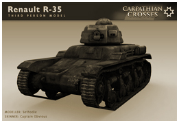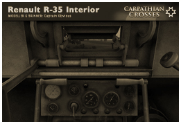 R-35 – francuski czołg wsparcia piechoty dla dwóch osób, z zasobem 60 rund amunicji. Zostały użyte podczas wyzwolenia Besarabii, Północnej Bukowiny oraz podczas oblężenia Odessy. Bardzo ciężki pancerz oraz mały kaliber działka powodują, że spełniał on rolę jako właśnie wsparcie dla piechoty. Mamy nadzieję, że spodoba się on fanom czołgów, ponieważ wiele serca włożyliśmy aby wiernie oddać wnętrze tego czołgu.